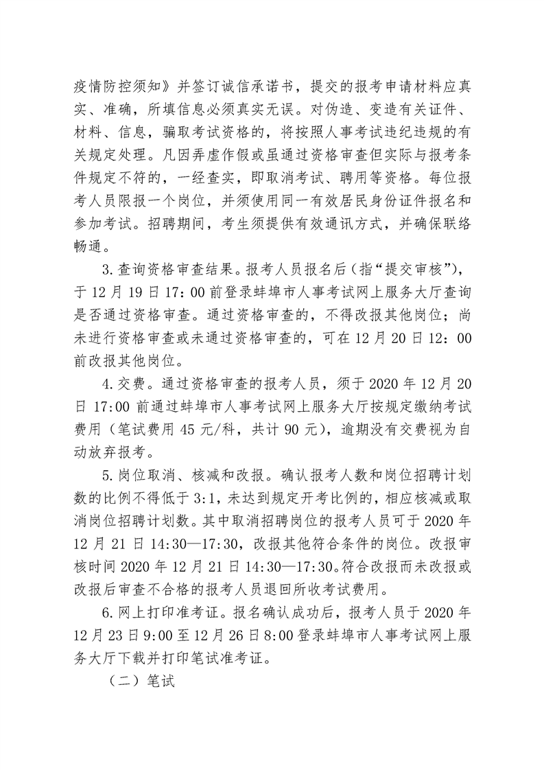 4.交費。通過資格審查的報考人員,須于2020年12月20日17:00前通過蚌埠市人事考試網(wǎng)上服務(wù)大廳按規(guī)定繳納考試費用(筆試費用45元/科,共計90元),逾期沒有交費視為自動放棄報考。