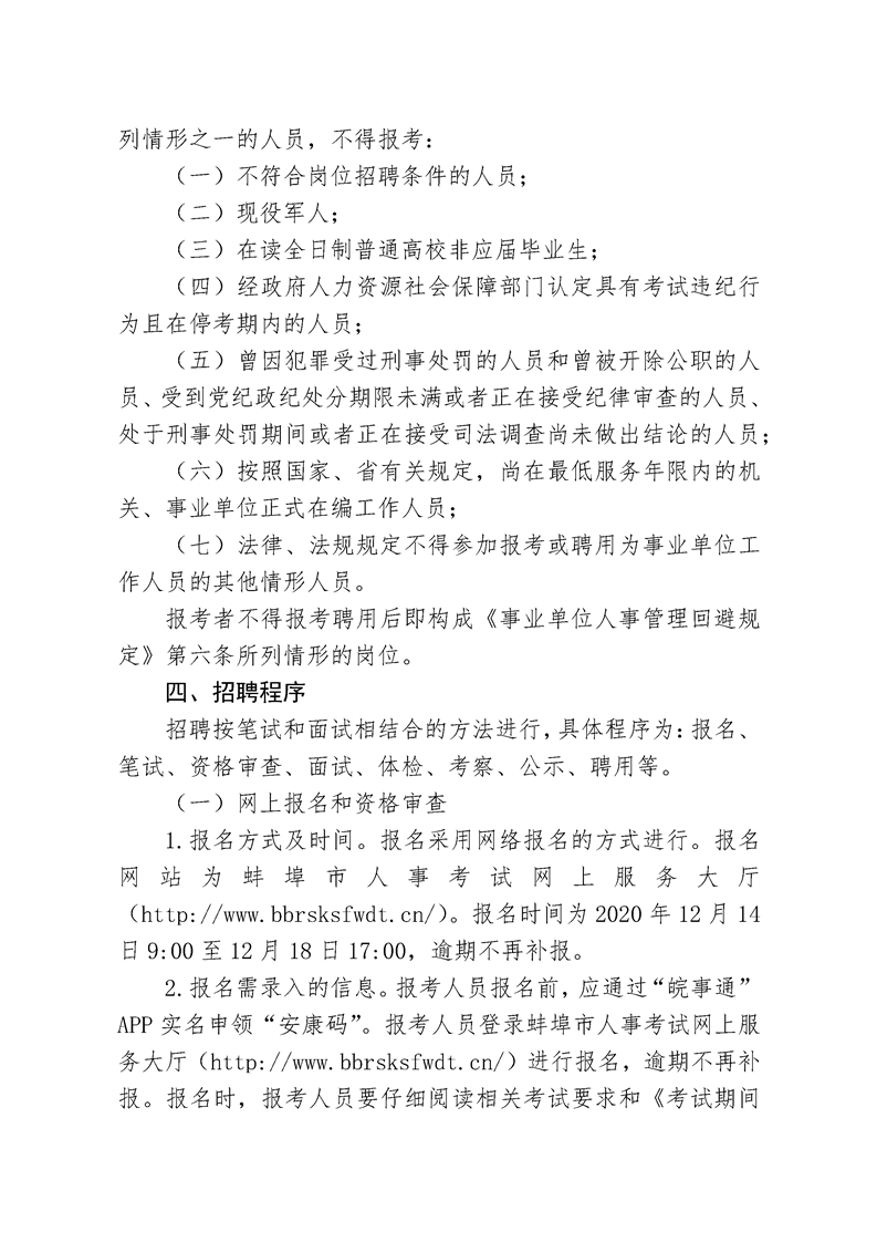 2.報名需錄入的信息。報考人員報名前,應(yīng)通過“皖事通”APP實名申領(lǐng)“安康碼”。報考人員登錄蚌埠市人事考試網(wǎng)上服務(wù)大廳(http://www.bbrsksfwdt.cn/)進行報名,逾期不再補報。報名時,報考人員要仔細閱讀相關(guān)考試要求和《考試期間疫情防控須知》并簽訂誠信承諾書,提交的報考申請材料應(yīng)真實、準確,所填信息必須真實無誤。對偽造、變造有關(guān)證件、材料、信息,騙取考試資格的,將按照人事考試違紀違規(guī)的有關(guān)規(guī)定處理。凡因弄虛作假或雖通過資格審查但實際與報考條件規(guī)定不符的,一經(jīng)查實,即取消考試、聘用等資格。每位報考人員限報一個崗位,并須使用同一有效居民身份證件報名和參加考試。招聘期間,考生須提供有效通訊方式,并確保聯(lián)絡(luò)暢通。