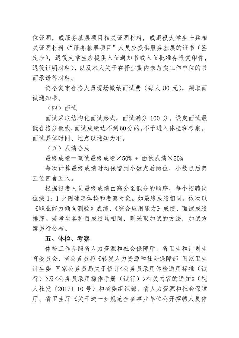 體檢工作參照省人力資源和社會保障廳、省衛(wèi)生和計劃生育委員會、省公務(wù)員局《轉(zhuǎn)發(fā)人力資源和社會保障部 國家衛(wèi)生計生委 國家公務(wù)員局關(guān)于修訂<公務(wù)員錄用體檢通用標(biāo)準(試行)>及<公務(wù)員錄用操作手冊(試行)>有關(guān)內(nèi)容的通知》(皖人社發(fā)〔2017〕10號)和省委組織部、省人力資源和社會保障廳、省衛(wèi)生廳《關(guān)于進一步規(guī)范全省事業(yè)單位公開招聘人員體檢工作的通知》(皖人社秘〔2013〕208號)等規(guī)定執(zhí)行。體檢費用由報考人員自理。