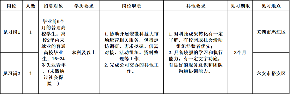 因工作需要,經(jīng)安徽科技大市場建設(shè)運營有限責(zé)任公司研究決定,委托安徽皖信人力資源管理有限公司公開招募2名見習(xí)人員?,F(xiàn)就有關(guān)事項公告如下: