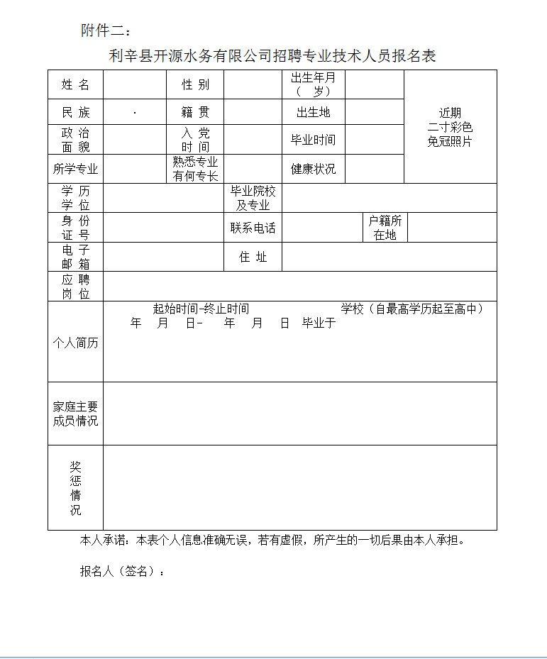 2、《利辛縣開(kāi)源水務(wù)有限公司招聘專業(yè)技術(shù)人員報(bào)名表》