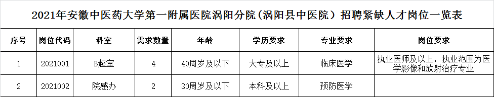 根據(jù)工作需要,需招聘緊缺人才6人,具體招聘人數(shù)和條件見《2021年安徽中醫(yī)藥大學第一附屬醫(yī)院渦陽分院(渦陽縣中醫(yī)院)招聘緊缺人才崗位一覽表》(附件1)