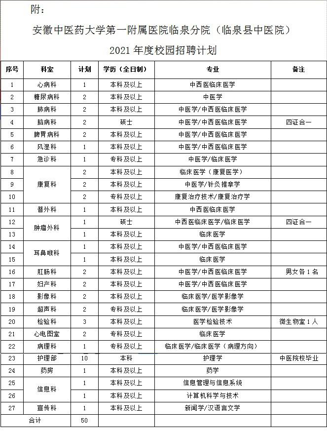 附:安徽中醫(yī)藥大學(xué)第一附屬醫(yī)院臨泉分院(臨泉縣中醫(yī)院)2021年度校園招聘計(jì)劃