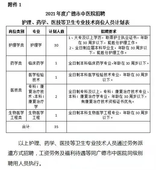 經(jīng)廣德市中醫(yī)院委托,按照公開、平等、競爭、擇優(yōu)的原則,面向社會公開招聘護理人員30名、藥學(xué)1名、醫(yī)技3名、生物醫(yī)學(xué)工程1名,由我公司派遣至廣德市中醫(yī)院工作,現(xiàn)將有關(guān)事項公告如下。