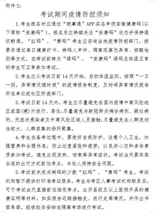 報考人員報名前,應(yīng)通過“皖事通”APP實名申領(lǐng)“安康碼”。報考人員報考前請認真閱讀《考試期間疫情防控須知》(附件2)。報考人員提供的信息必須與本人實際情況、報考條件和所報考的崗位要求相一致。凡弄虛作假通過資格審查,其實際情況與報考條件規(guī)定不符的,一經(jīng)查實,即取消考試、聘用等資格。