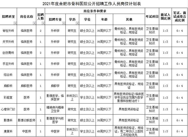 合肥市骨科醫(yī)院公開招聘12名工作人員,具體招聘崗位及條件見《2021年度合肥市骨科醫(yī)院公開招聘工作人員崗位計劃表》(附件1)。