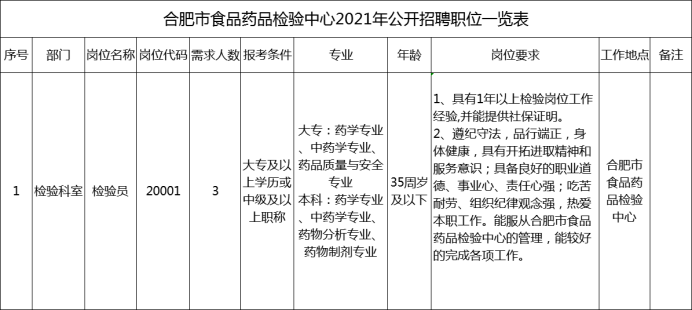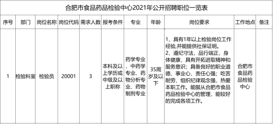 因工作需要,合肥市食品藥品檢驗中心面向社會公開招聘3名檢驗員。具體如下: