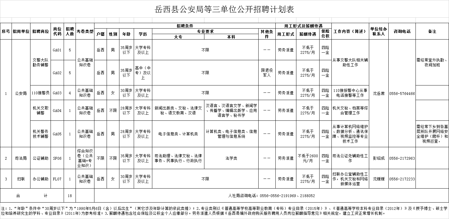 招聘單位部門電話見《岳西縣公安局等三單位公開招聘計劃表》。