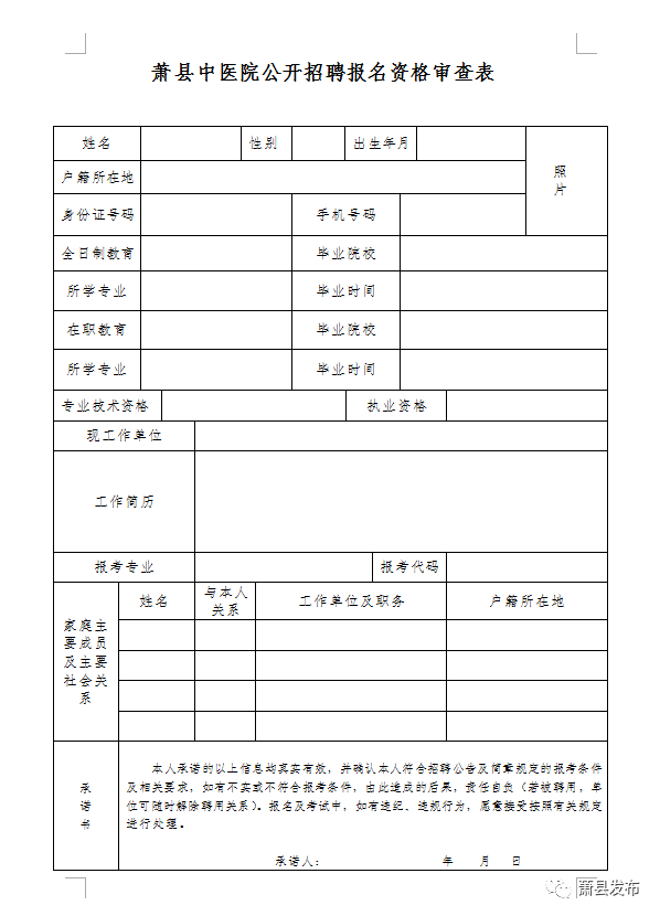 3、資格審查:報名的同時進行資格審查,提供本人身份證、畢業(yè)證(應(yīng)屆生提供就業(yè)推薦表)、學歷證書電子注冊備案表(學信網(wǎng)打印)、學士證、執(zhí)業(yè)資格證、專業(yè)技術(shù)資格證等材料,上述證件和證明材料均要求提供原件和復(fù)印件及小2寸近期免冠正面彩色照片4張,填寫《蕭縣中醫(yī)院公開招聘人員報名表》(表格自行下載打印),每人只能選擇一個崗位報考。