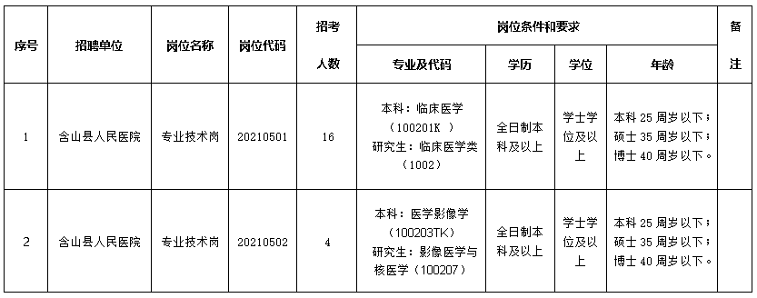 本次專場招聘計劃招聘專業(yè)技術(shù)人員20名,招聘崗位計劃見《含山縣縣級公立醫(yī)院2021年皖南醫(yī)學(xué)院專場招聘衛(wèi)生專業(yè)技術(shù)人員崗位計劃表》(附件1)。