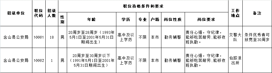 本次招聘警務(wù)輔助人員19名,具體職位見《馬鞍山市公安局含山片區(qū)招聘警務(wù)輔助人員職位表》(附件1)。