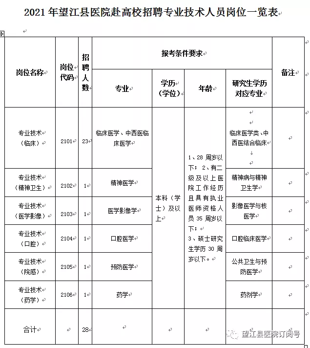 招聘崗位計劃數 28個。具體招聘崗位、人數、資格條件等詳見《2021年望江縣醫(yī)院赴高校招聘專業(yè)技術人員崗位一覽表》(附件1)。