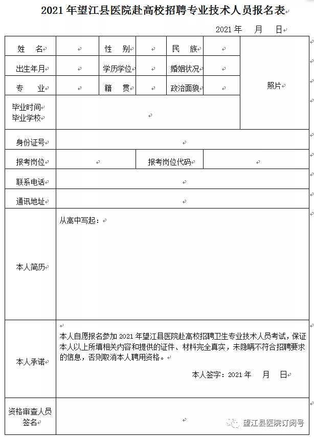 報考人員需填寫《2021年望江縣醫(yī)院赴高校招聘專業(yè)技術人員報名表》(附件2),歷屆畢業(yè)生需提供本人近期同底兩寸正面免冠照片4張,有效居民身份證、學歷(學位)證書原件及復印件、工作經歷證明等崗位所需的證明材料,其中屬機關事業(yè)單位在編正式工作人員的,還須按干部人事管理權限提供單位和主管部門同意報考的證明。