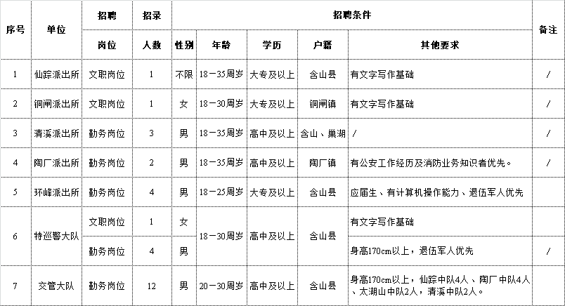 詳見附件1《含山縣公安局招聘警務輔助人員職位表》