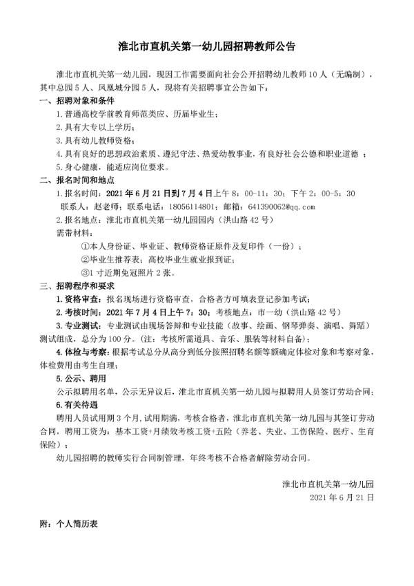 2021年淮北市直機關(guān)第一幼兒園招聘教師公告
