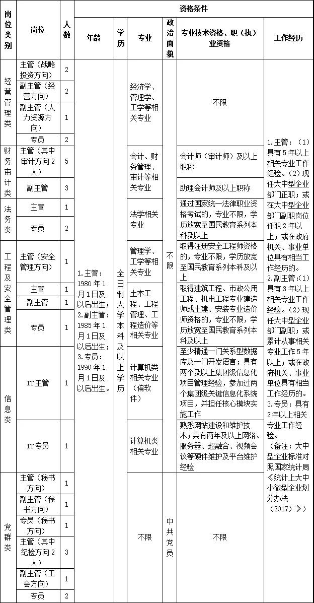 本次選聘競聘淮海實業(yè)集團(tuán)機(jī)關(guān)33個崗位(見下表)。集團(tuán)機(jī)關(guān)在崗工作人員參加競聘的,其資格條件按照《集團(tuán)公司管理和專業(yè)技術(shù)崗位管理辦法》(淮海發(fā)〔2020〕115號)第十二條的第三、四、五款執(zhí)行;其他人員報名按以下資格條件執(zhí)行。
