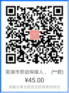 3. 掃碼繳費(fèi)。應(yīng)聘者掃碼繳納報(bào)名費(fèi)用45元。請(qǐng)用支付寶掃碼后添加備注,注明考生姓名、報(bào)考崗位。根據(jù)安徽省財(cái)政廳、安徽省物價(jià)局財(cái)綜〔2013〕2568號(hào)文件規(guī)定,按每人每科45元標(biāo)準(zhǔn)收取筆試費(fèi)用。享受國(guó)家最低生活保障金城鎮(zhèn)家庭和農(nóng)村特困家庭的報(bào)考人員享受減免考試費(fèi)用政策(先交后退,退費(fèi)時(shí)需提供相關(guān)材料)。