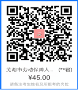 4、掃碼繳費(fèi)。應(yīng)聘者掃碼繳納報(bào)名費(fèi)用45元。請(qǐng)用支付寶掃碼后添加備注,注明考生姓名、報(bào)考崗位。根據(jù)安徽省財(cái)政廳、安徽省物價(jià)局財(cái)綜〔2013〕2568號(hào)文件規(guī)定,按每人每科45元標(biāo)準(zhǔn)收取筆試費(fèi)用。享受國家最低生活保障金城鎮(zhèn)家庭和農(nóng)村特困家庭的報(bào)考人員享受減免考試費(fèi)用政策(先交后退,退費(fèi)時(shí)需提供相關(guān)材料)。