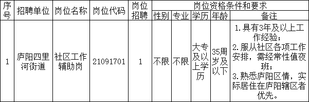 因工作需要,經(jīng)研究同意,委托遠(yuǎn)創(chuàng)人力資源管理集團(tuán)有限公司,公開(kāi)招聘廬陽(yáng)區(qū)四里河街道社區(qū)工作輔助崗人員1名?,F(xiàn)就有關(guān)事項(xiàng)公告如下: