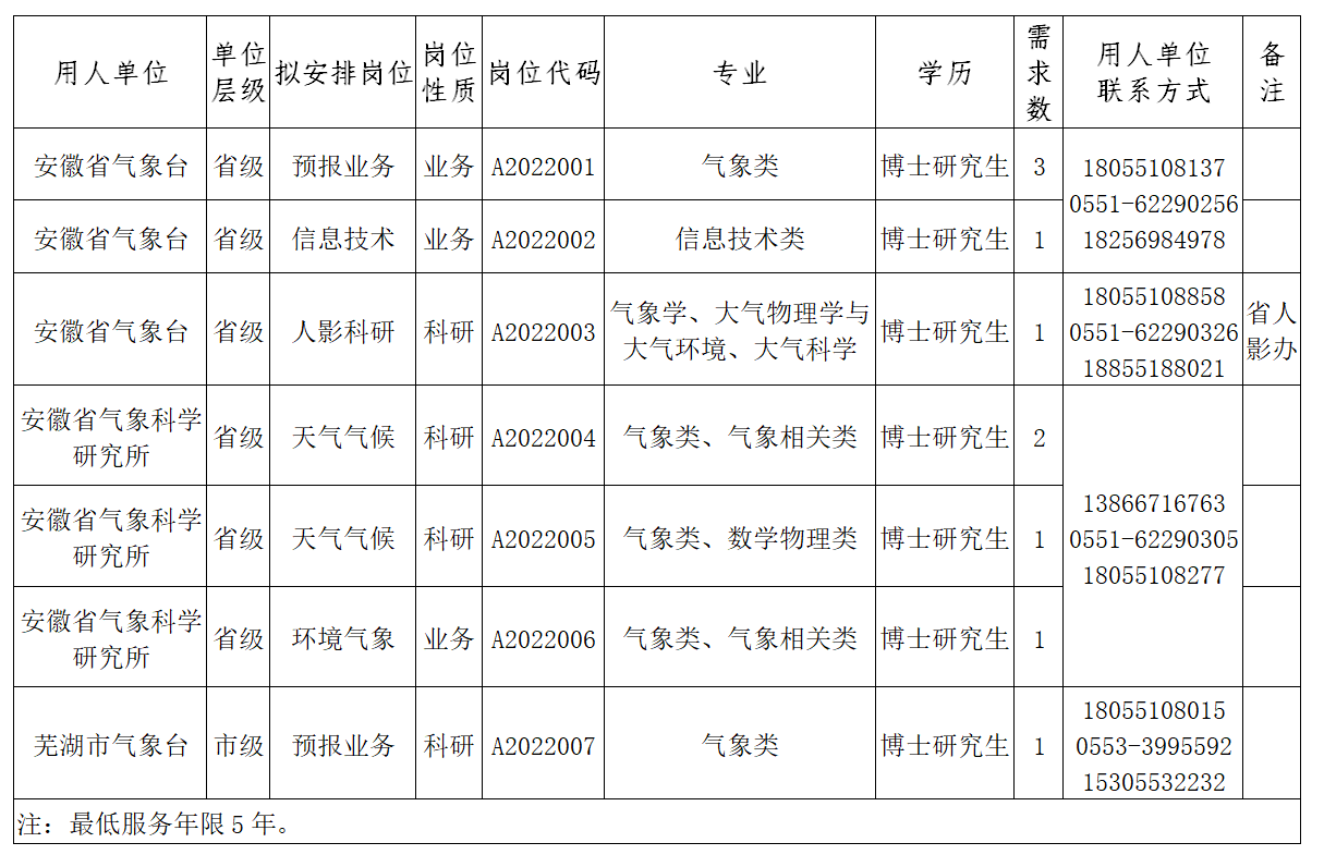 此次招聘崗位為博士崗位。具體單位、崗位、專業(yè)、學歷要求等詳見《安徽省氣象局2022年度事業(yè)單位博士研究生崗位需求表》。