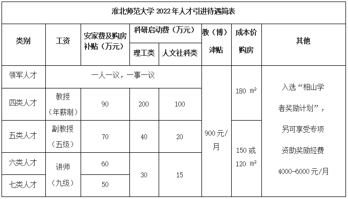 2. 四類至七類人才:引進的四類至七類人才享受《淮北師范大學人才引進待遇簡表》中相應的安家費及購房補貼、科研啟動費、教授(博士)津貼、成本價購房等待遇;其配偶具有學士及以上學位,可在校內安排工作。同時,聘期(6年)內入選“相山學者獎勵計劃”,另可享受專項資助獎勵經(jīng)費4000-6000元/月。引進人才的具體聘期任務及待遇以雙方合同約定為準(教育部重點實驗室聘用人才的待遇另行約定)。