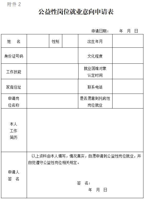 (一)報(bào)名。符合條件人員請(qǐng)于2022年3月8日前填寫《公益性崗位就業(yè)意向申請(qǐng)表》(見(jiàn)附件2),向市就業(yè)管理中心提交報(bào)名申請(qǐng)。