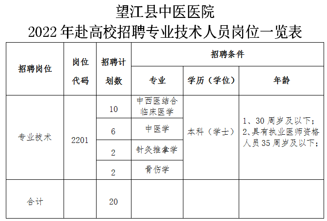 招聘崗位計(jì)劃數(shù)20個(gè)。具體招聘崗位、人數(shù)、資格條件等詳見《望江縣中醫(yī)醫(yī)院2022年赴高校招聘專業(yè)技術(shù)人員崗位一覽表》(附件1)。