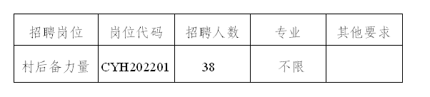 因工作需要,經(jīng)研究,現(xiàn)面向社會公開招聘陳瑤湖鎮(zhèn)38名村級后備力量,現(xiàn)將有關事項公告如下: