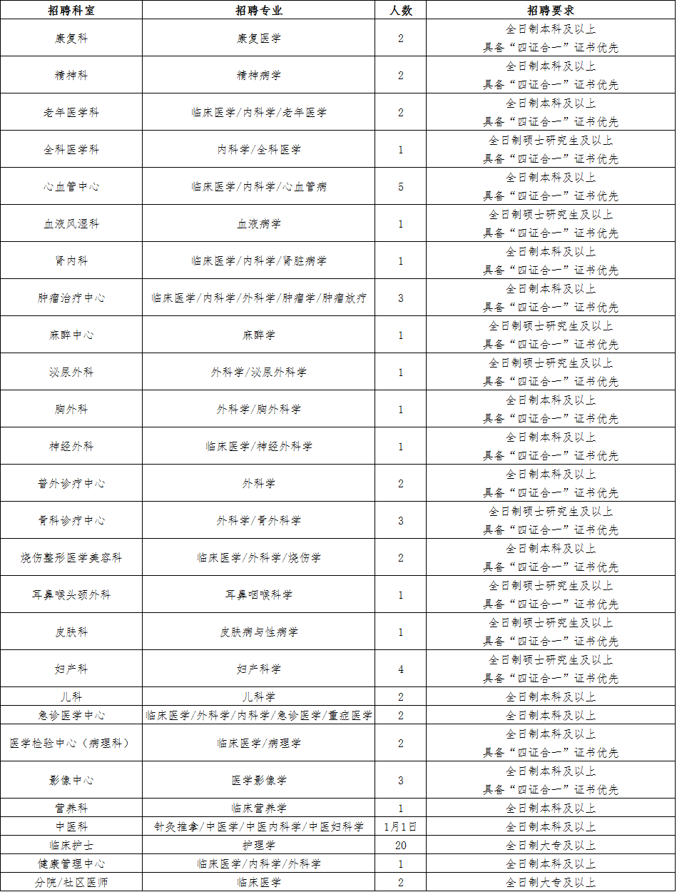 3、除以下崗位外,歡迎各科室中、高級職稱、各學科帶頭人洽談合作。