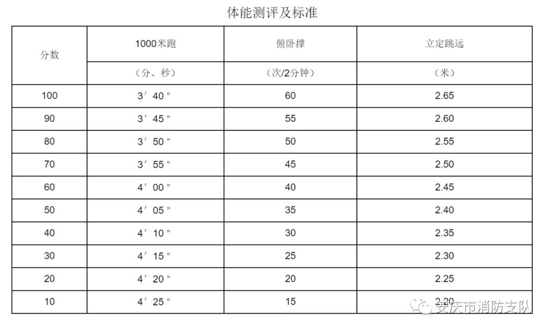 3、體能測評成績:測試成績采取從高到低排名,換算為對應(yīng)的百分制成績測算,滿分為100分,體能測評三個(gè)項(xiàng)目必須達(dá)標(biāo)(60分)。