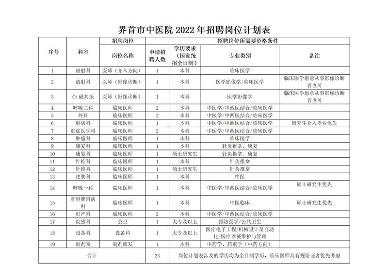 本次計(jì)劃公開招聘醫(yī)療衛(wèi)生專業(yè)技術(shù)人員23名,具體招聘崗位、人數(shù)、專業(yè)、報(bào)考條件等詳見《界首市中醫(yī)院2022年招聘崗位計(jì)劃表》(附件)。