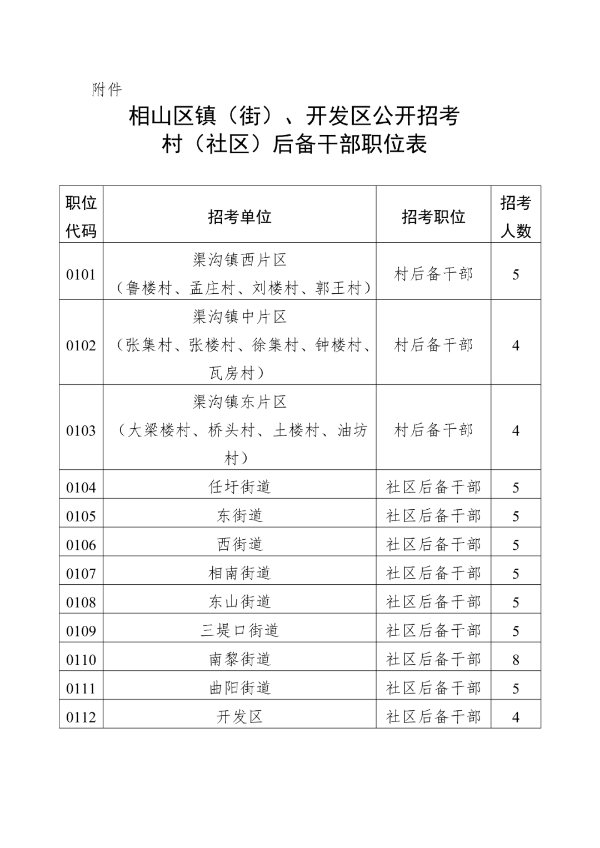 附件:相山區(qū)鎮(zhèn)(街)、開發(fā)區(qū)公開招考村(社區(qū))后備干部職位表。