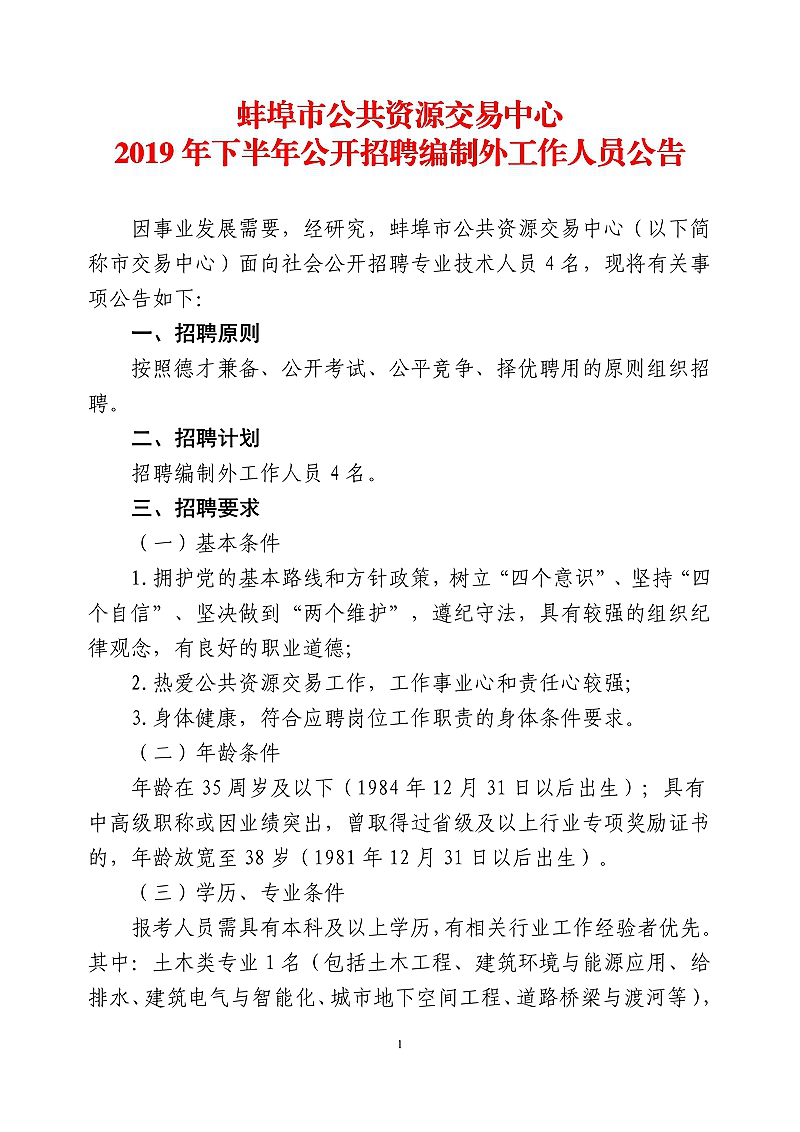 2019年下半年蚌埠市公共資源交易中心公開招聘編制外工作人員公告