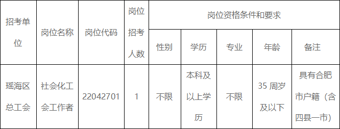 結(jié)合實(shí)際工作需要,經(jīng)研究決定,瑤海區(qū)總工會(huì)2022年面向合肥市公開招聘社會(huì)化工會(huì)工作者1名,現(xiàn)將有關(guān)事項(xiàng)公告如下: