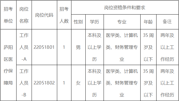 結合實際工作需要,經(jīng)研究決定,廬陽區(qū)醫(yī)療保障局2022年面向社會公開招聘政府購買服務崗位工作人員2名,現(xiàn)將有關事項公告如下: