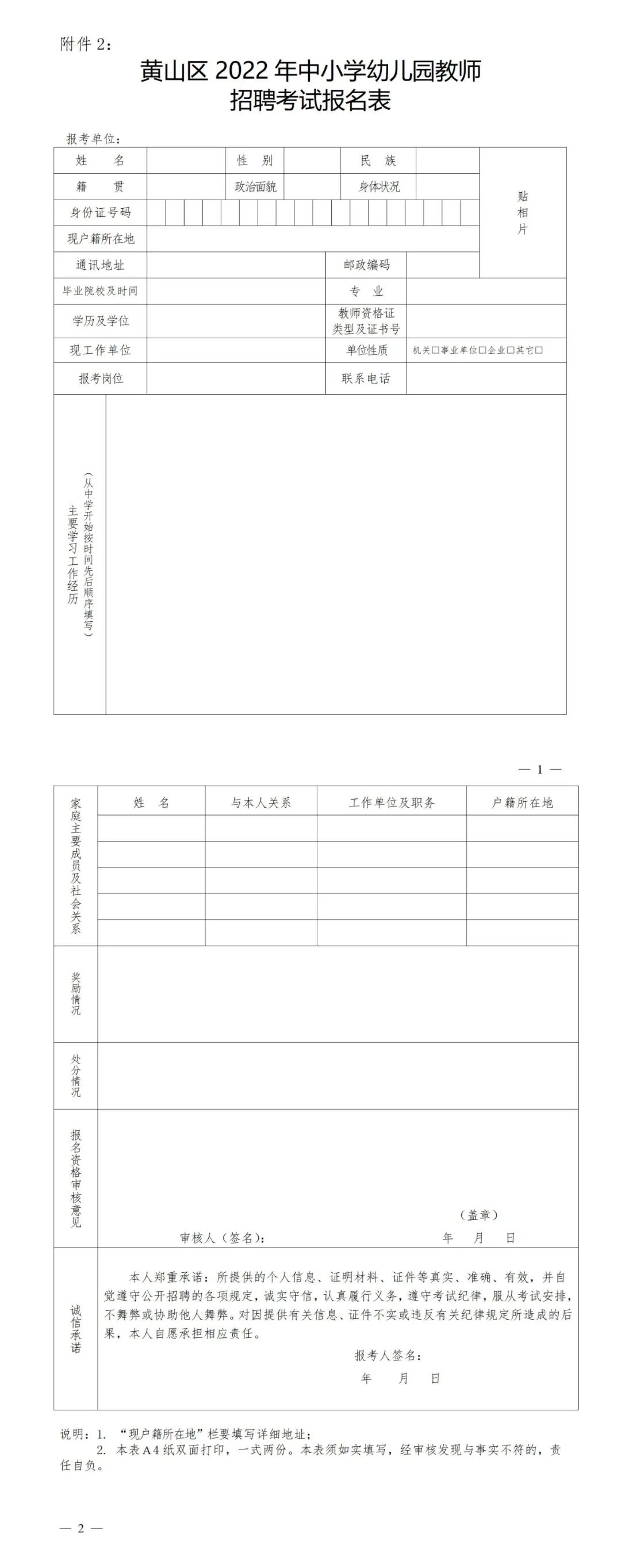 (1)提供《黃山區(qū)2022年中小學幼兒園教師招聘考試報名表》(詳見附件2),一式兩份,提前填寫,貼好照片。