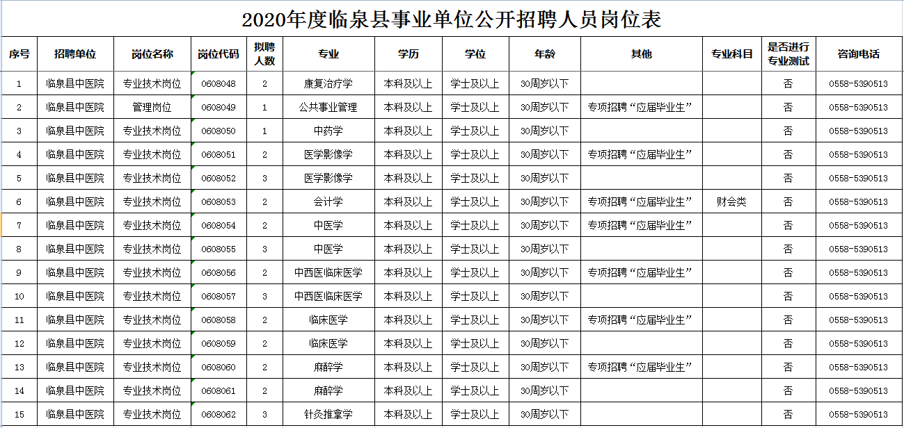 2020年度臨泉縣事業(yè)單位面向社會公開招聘人員工作已經(jīng)開始,臨泉縣中醫(yī)院計劃帶編招錄32人。
