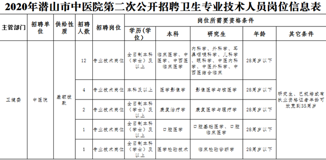 2020年,潛山市中醫(yī)院第二次公開招聘衛(wèi)生專業(yè)技術(shù)人員20 名,詳見附件1:《2020年潛山市中醫(yī)院第二次公開招聘衛(wèi)生專業(yè)技術(shù)人員崗位信息表》。