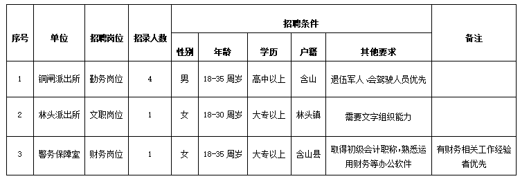 林頭派出所、警務(wù)保障室各招1名文職警務(wù)輔助人員,銅閘派出所招4名勤務(wù)警務(wù)輔助人員,具體要求詳見附件。