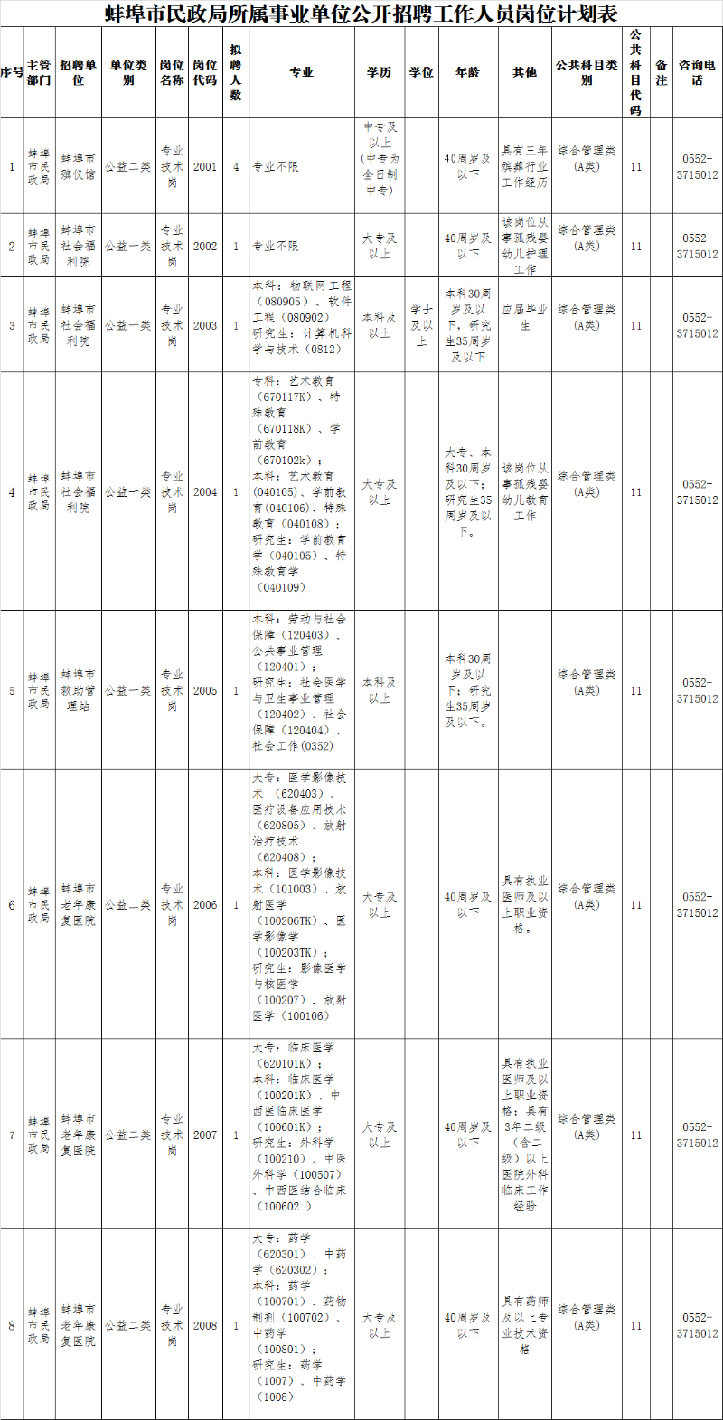 附件1:蚌埠市民政局所屬事業(yè)單位公開招聘工作人員崗位計劃表