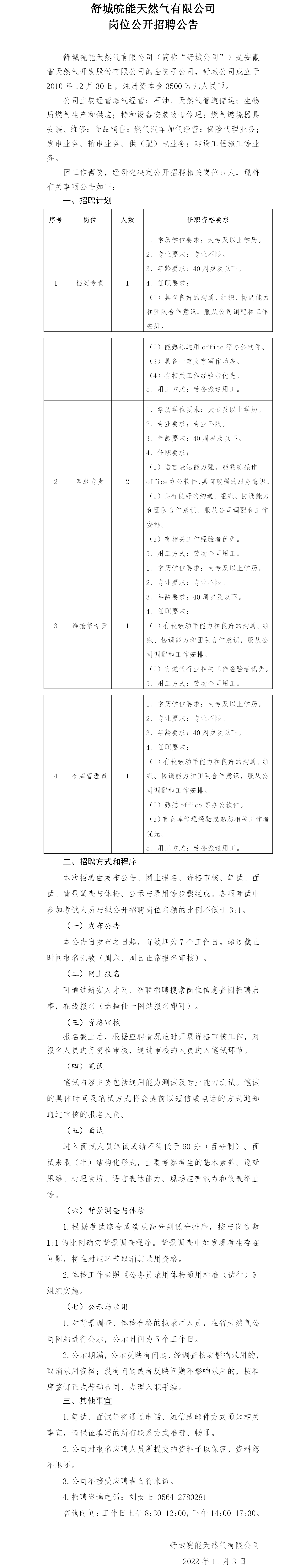 2022年六安舒城皖能天然氣有限公司崗位公開(kāi)招聘公告