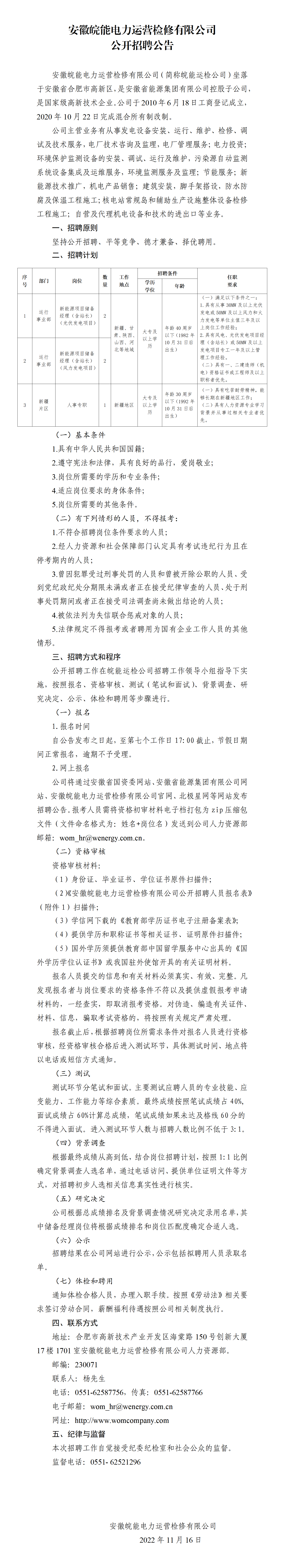 2022年安徽皖能電力運營檢修有限公司公開招聘公告