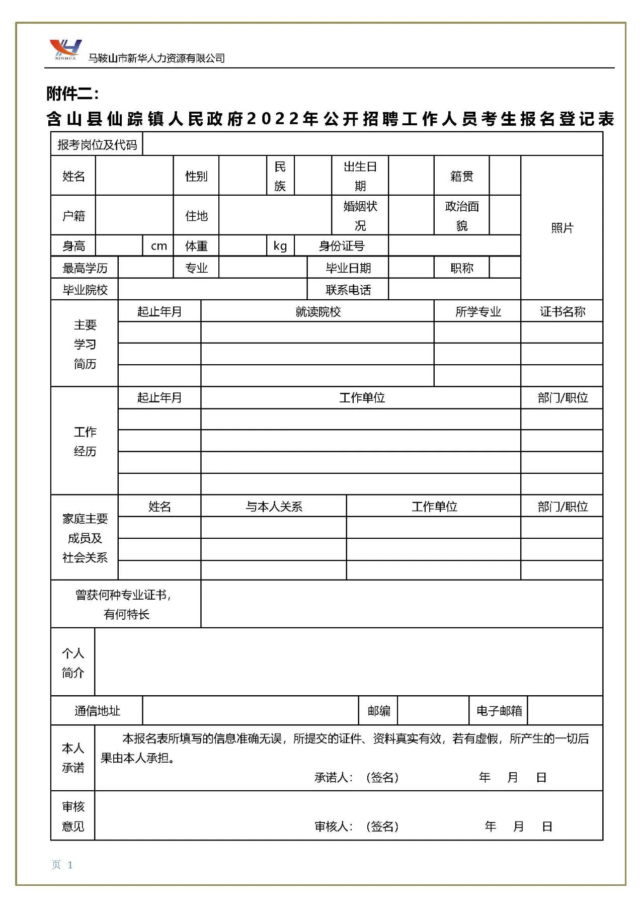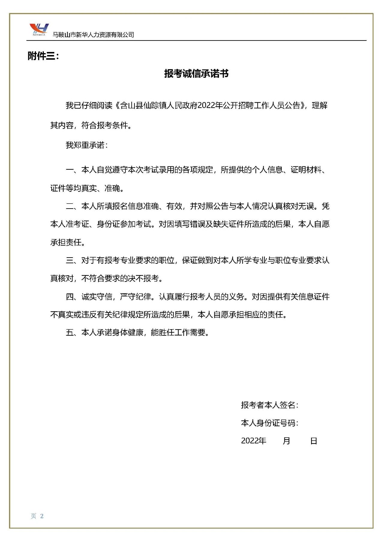(1)本人簽名確認的《含山縣仙蹤鎮(zhèn)人民政府2022年公開招聘工作人員考生報名登記表》(附件二,請自行下載填寫并打印);