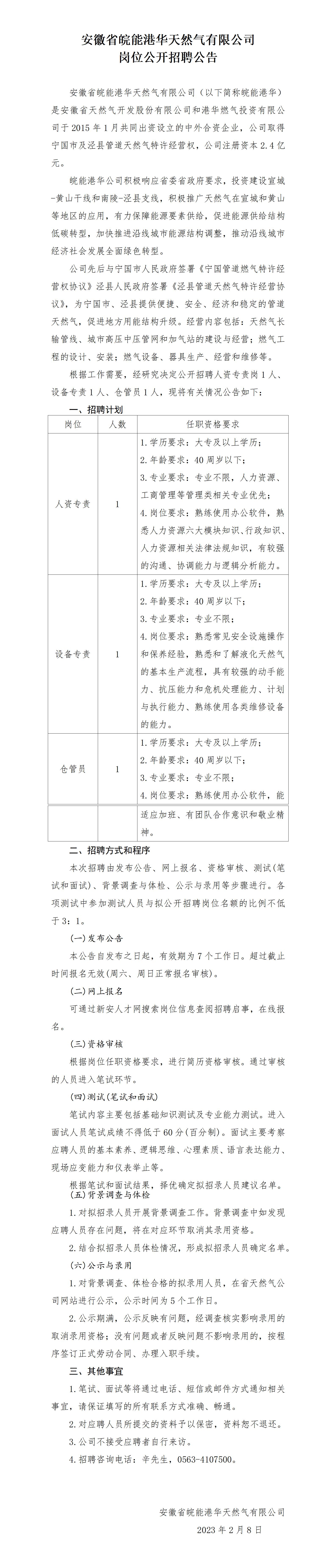2023年安徽省皖能港華天然氣有限公司崗位公開招聘公告