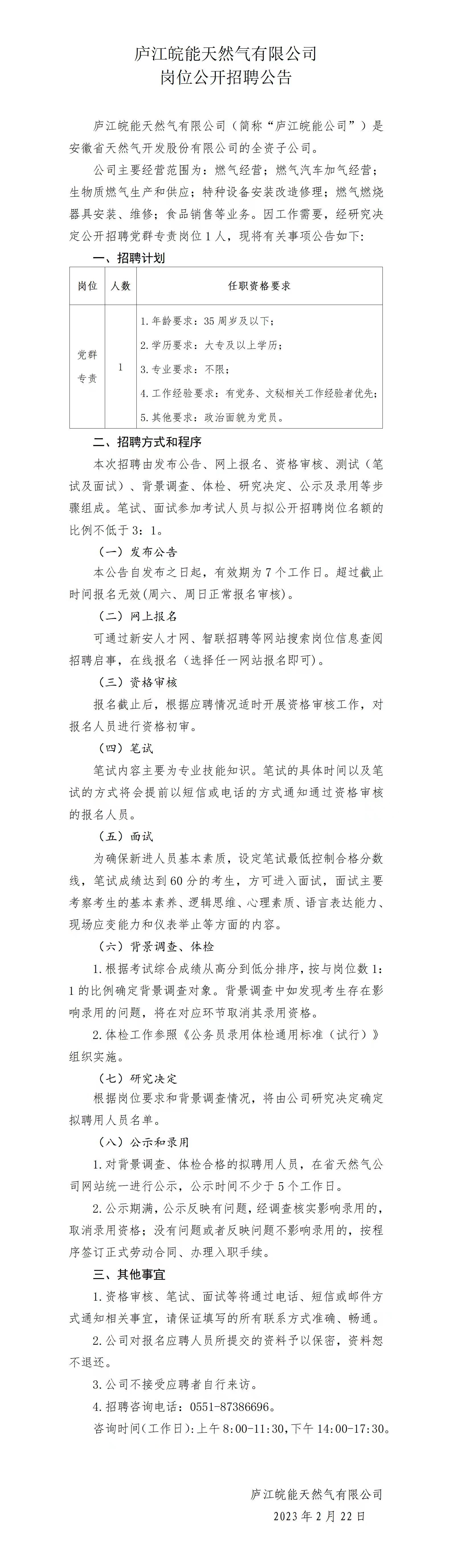 2023年合肥廬江皖能天然氣有限公司崗位公開(kāi)招聘公告