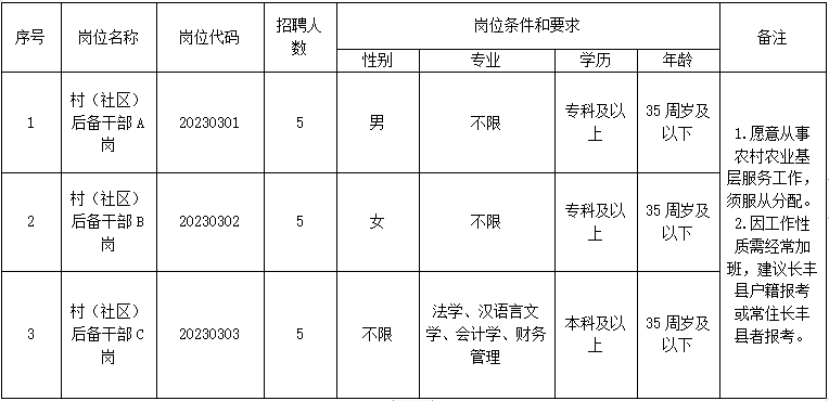 2023-03-07 22:54:15閱讀()長(zhǎng)豐縣人民政府為提高農(nóng)村基層黨組織領(lǐng)導(dǎo)能力和治理水平,夯實(shí)基層基礎(chǔ),為村級(jí)培養(yǎng)和儲(chǔ)備德才兼?zhèn)涞暮髠淙瞬?。?jīng)研究,長(zhǎng)豐縣崗集鎮(zhèn)人民政府決定面向社會(huì)公開招聘村(社區(qū))后備干部15名?,F(xiàn)將有關(guān)事項(xiàng)公告如下: