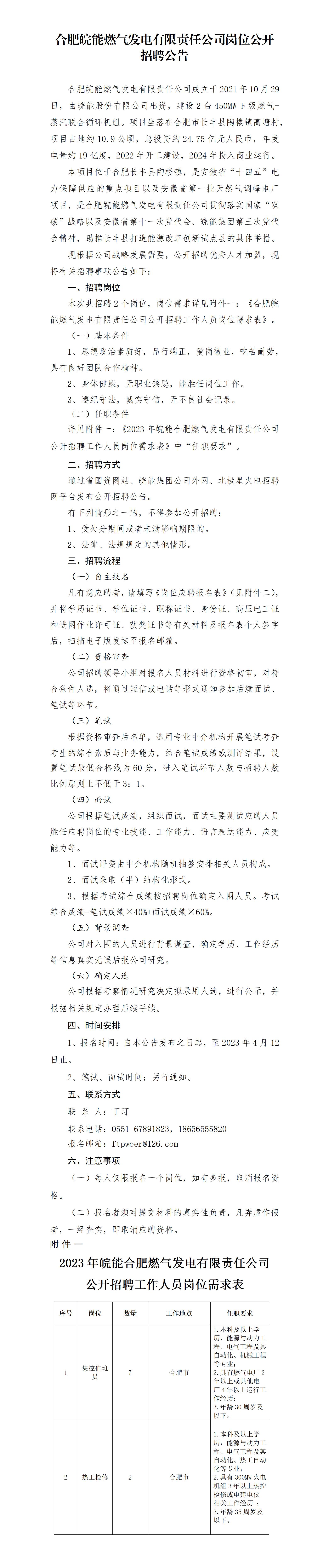2023年合肥皖能燃?xì)獍l(fā)電有限責(zé)任公司崗位公開(kāi)招聘公告