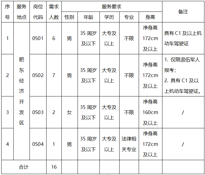 計(jì)劃招聘城市管理輔助項(xiàng)目服務(wù)人員16名,具體要求如下: