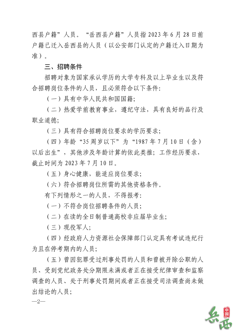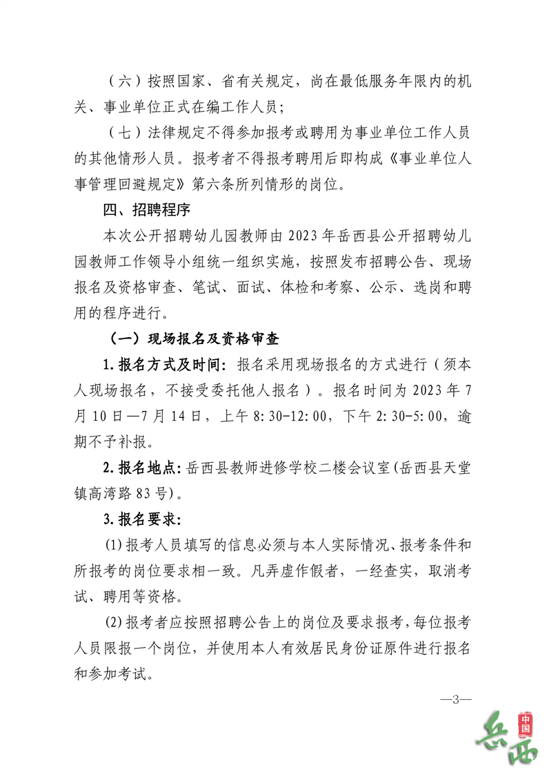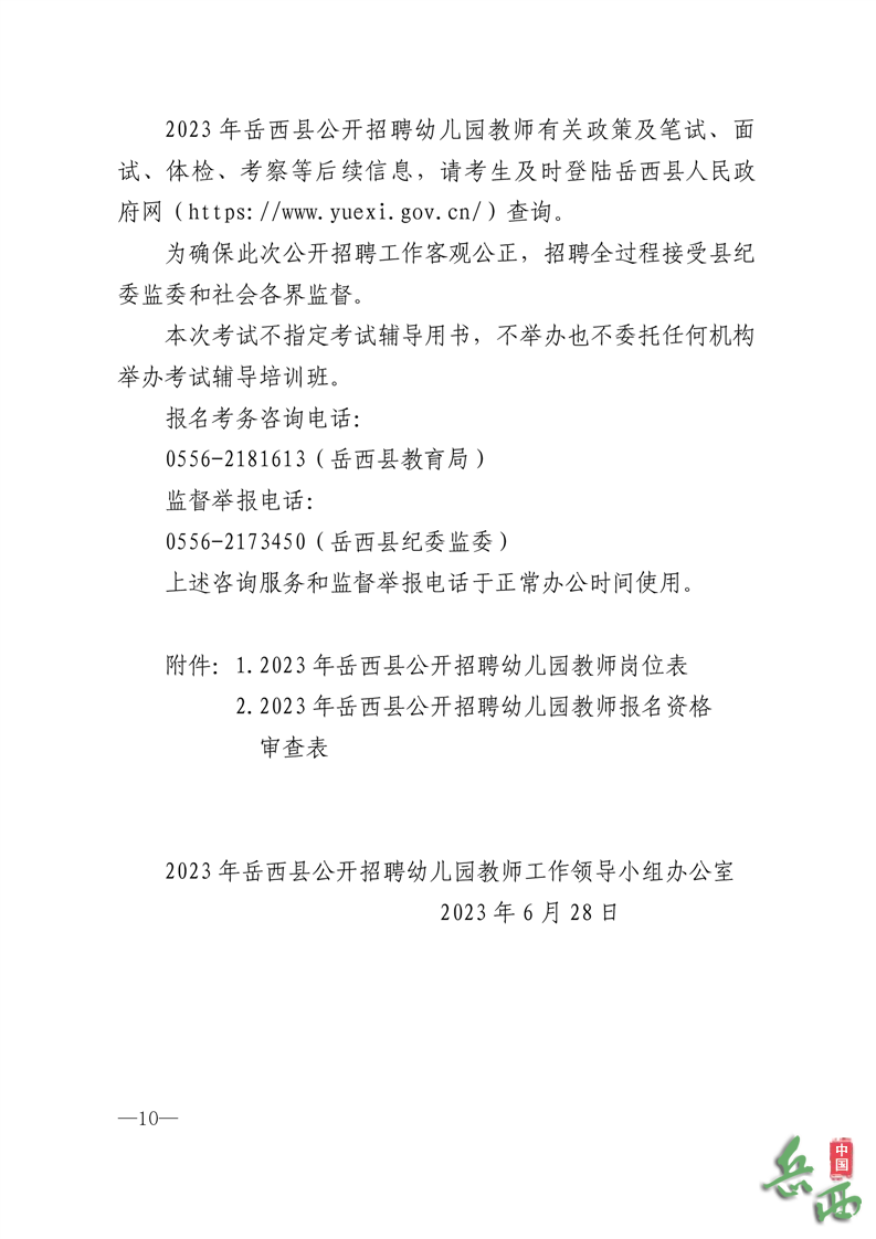 2023-06-28 19:11:22閱讀()岳西縣人民政府根據(jù)《安徽省事業(yè)單位公開招聘人員暫行辦法》(皖人社發(fā)〔2010]78號)、《關(guān)于進(jìn)一步做好艱苦邊遠(yuǎn)地區(qū)縣鄉(xiāng)事業(yè)單位公開招聘工作的實(shí)施意見》(皖人社發(fā)〔2017〕21號)、《關(guān)于創(chuàng)新體制機(jī)制加強(qiáng)公辦幼兒園教職工隊(duì)伍建設(shè)的意見》(皖編辦〔2020〕272號)、《岳西縣落實(shí)公辦幼兒園編制保障和非編保教人員待遇的方案》(岳政辦秘〔2021] 79號)規(guī)定和要求,現(xiàn)就2023年岳西縣公開招聘幼兒園教師有關(guān)事項(xiàng)公告如下: