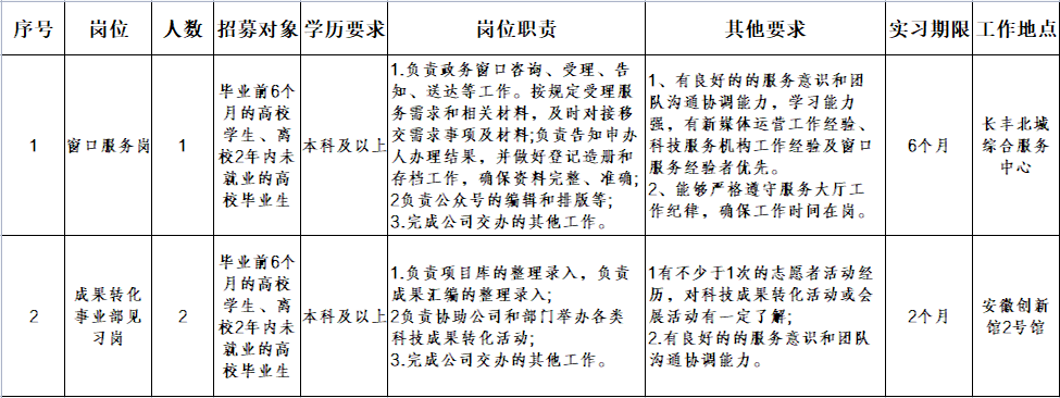 2023-07-04 17:19:48閱讀()安徽公共招聘網(wǎng)安徽科技大市場(chǎng)建設(shè)運(yùn)營(yíng)有限責(zé)任公司成立于2020年9月,是國(guó)有全資有限責(zé)任公司,公司以推動(dòng)構(gòu)建專(zhuān)業(yè)化、市場(chǎng)化、國(guó)際化的科技成果轉(zhuǎn)化市場(chǎng)服務(wù)體系為目標(biāo),依托安徽創(chuàng)新館,建強(qiáng)用好安徽科技大市場(chǎng),打造合肥濱湖科學(xué)城高質(zhì)量發(fā)展新引擎?,F(xiàn)因工作需要,面向社會(huì)招募3名見(jiàn)習(xí)人員,有關(guān)事項(xiàng)公告如下: